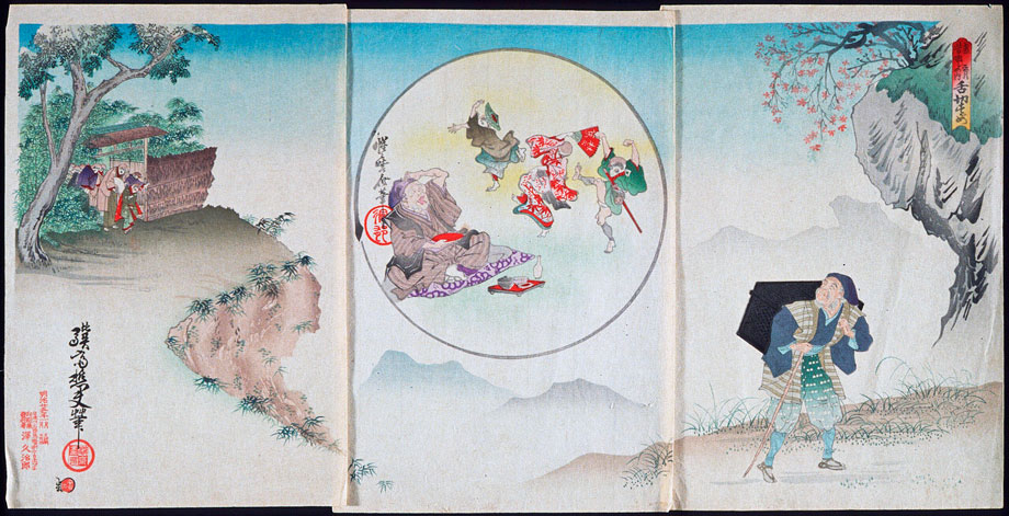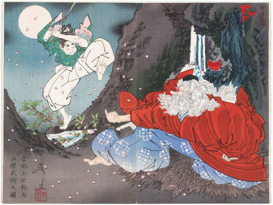 鞍馬寺の大天狗・僧正房と剣術修行する遮那王(月岡芳年 明治時代)