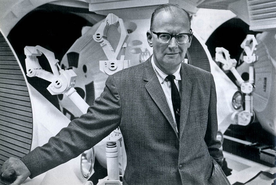 映画『2001年宇宙の旅』のセットを背景にしたアーサー・C・クラーク(1965年)