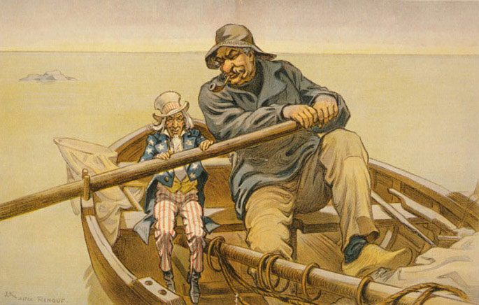 モルガンの経済界に於ける権力はアメリカ連邦政府より大きいことを、連邦政府を小さなアンクル・サムに擬人化して描いたイラスト(1881年)
